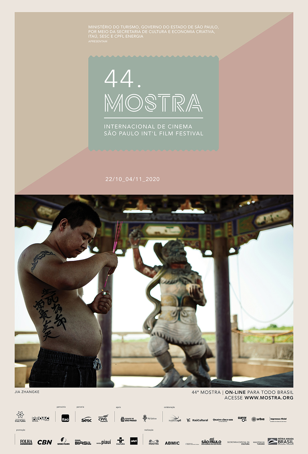 Da China, que foi tão falada este ano, veio também a arte da 44ª Mostra Internacional de Cinema, uma emblemática foto do grande cineasta Jia Zhangke, na qual um homem acende incensos para a estátua de WenQuxing, legendária divindade da literatura e da escrita. Jia também nos traz o documentário Nadando Até o Mar se Tornar Azul e o curta A Visita, em que a Covid é o principal personagem.